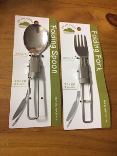 それで、割と満足していたのですが、先日、100円均一のセリアに行ったら、なんとですね・・・このユニフレームのカトラリーと同じようなフォークとスプーンを発見!